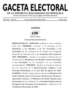 De acuerdo con la Resolución N.° 250604-046, se resuelve a convocar a las elecciones de las Alcaldesas y los Alcaldes y de las Concejalas y los Concejales de los municipios de los estados de la República Bolivariana de Venezuela, para el día veintisiete (27) de julio de 2025.