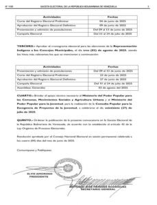 También se aprueba el cronograma comicial para las elecciones de las Alcaldesas y los Alcaldes y de las Concejalas y los Concejales de los municipios con sus actividades correspondientes. Además, se aprueba el cronograma electoral para la elegir de la Representación Indígena a los Concejos Municipales, el día tres (03) de agosto de 2025.