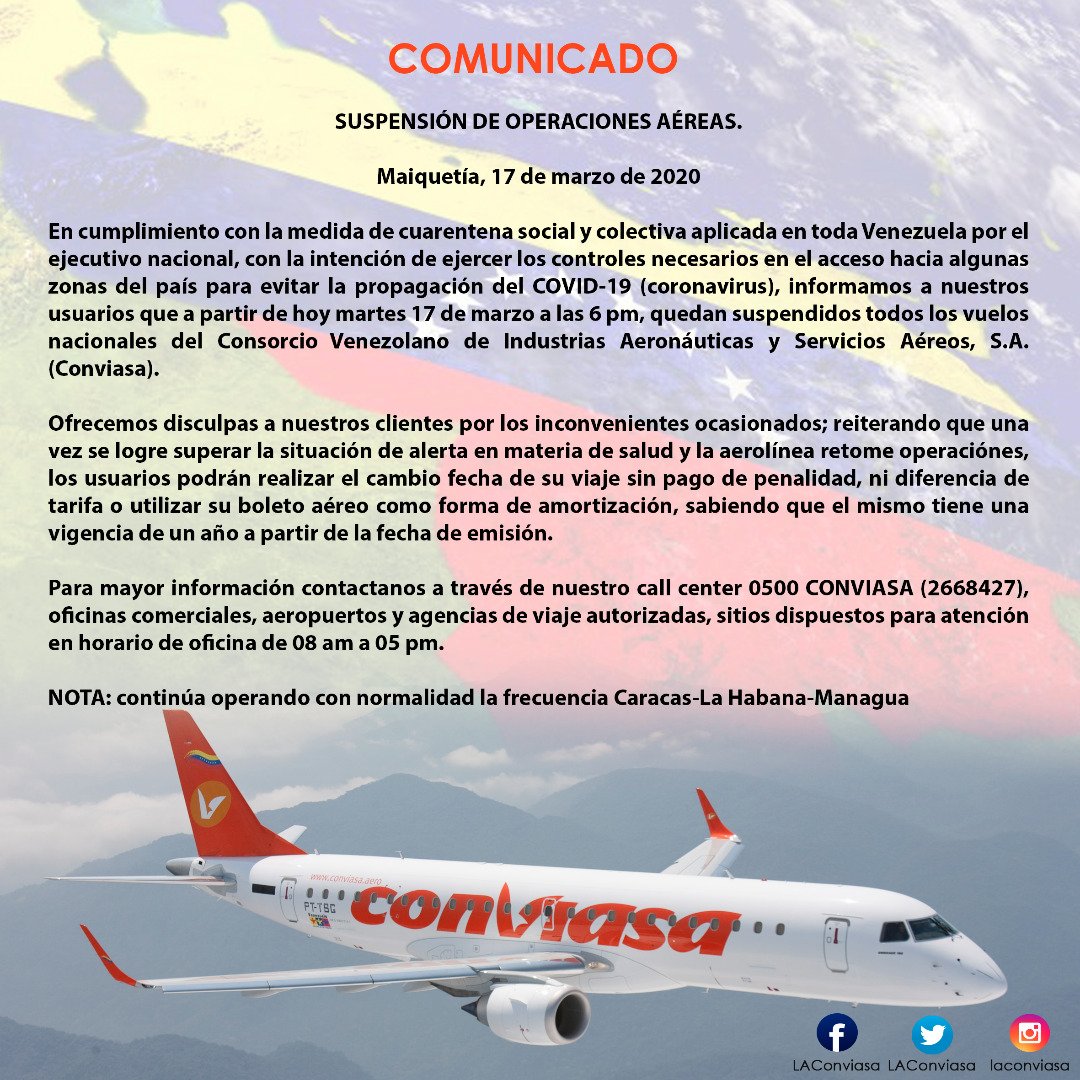 Este martes, la línea aérea Conviasa informó a través de su cuenta en Twitter que desde las 06 de la tarde de este martes 17 de marzo, quedan suspendidos los vuelos nacionales.