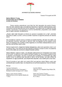 Estas madres enviaron una misiva a la primera dama de Estados Unidos, Melania de Trump, para solicitar una audiencia a fin de exigir y reiterar el llamado a que sean retornados estos niños, niñas y adolescentes que permanecen secuestrados en territorio norteamericano.