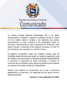 El canciller de la República Bolivariana de Venezuela, Yván Gil, denuncia ante la comunidad nacional e internacional el asalto hostil por parte de la Armada de los Estados Unidos a la embarcación atunera «Carmen Rosa», el pasado 12 de septiembre, donde de manera ilegal retuvieron a nueve pescadores que hacen faena en la Zona Económica Exclusiva en el mar venezolano, hecho considerado como una provocación directa y una agresión contra la nación.