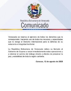 (12/08/2025) – El Ministerio del Poder Popular para Relaciones Exteriores de la Republica Bolivariana de Venezuela, emitió este martes un comunicado en el que expone que se le envió una nota verbal a la Republica Cooperativa de Guayana, denunciando la presencia de la petrolera ExxonMobil en la región.